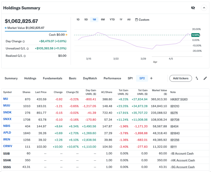 持ち株の方は、半導体メモリ特化ETFのDRAMとストレージ最大手のWDCを売却して、データセンター株のNBIS、APLD、IREN、CRWVを購入した。DRAMはまた買うかも知れないが動きが悪いので一旦売った。サムスン、SKハイニックスでETFの構成比の50%を占めており韓国市場の地合いに左右されるのと、サムスンは総合家電メーカーなので、メモリ部門が好調でも決算時に不採算部門の影響も受けるので、メモリだけ生産してる企業よりも動きが悪そうだ。更に韓国を代表するトップ企業なので色々な要因で上がりづらそうな感じがした。ただ2日間しか様子見てないのと市場に出てる株数が極端に少ないので、爆上げする要素もあるのでマイクロン(MU)が復活するとDRAMも上げて行きそうな気もする。