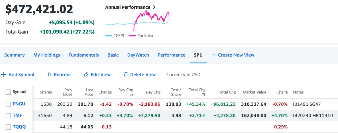 今日はFNGUを10万ドル分だけ売却、SOXLを全部売却で6万ドル、全部で16万ドルの資金を調達。その資金でTMFを31,650株購入した。利上げはもう無いだろうし、あってもあと1回だから金利は10月にピークを付けて下落傾向、利上げ終了確定と利下げの時期の話が市場でもちきりになると利下げ前から金利は下がるので今が買い時。TMFの価格は設定来の底値付近でただ見てるのはもったいない。