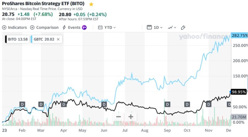 現物と先物のETFであるGBTCとBITOのパフォーマンス比較チャートは圧倒的に現物のGBTCが高い。GBTCは流動性も有り買えそうな雰囲気だが、OTC銘柄なので認可前は怖くて買えない。買うならBITOになるだろう。仮想通貨取引所でBTCをやり取りしなくても購入できる事と、すぐに証券口座内で売却して他の米国株を購入できるメリットは大きい。因みに日本国内では購入できないようだ。
