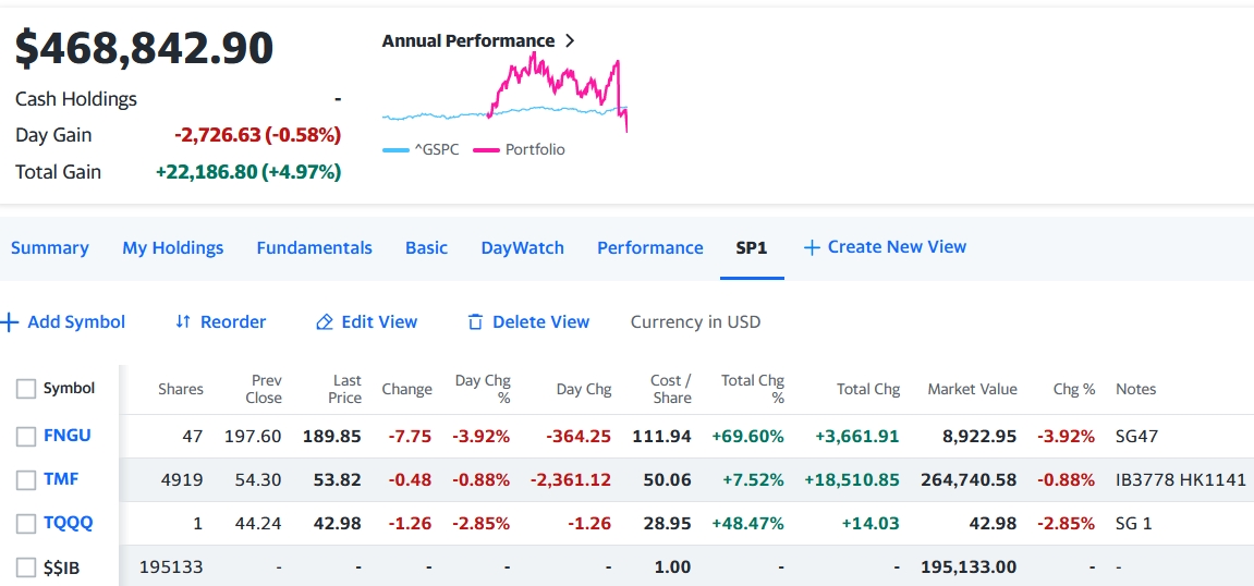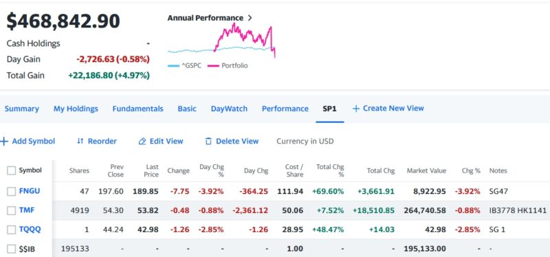 今日はトータルで-12942.03(-2.7%)のマイナスで引けた。スクリーンショットの数字はFNGU売却で数字がおかしいので前日の合計額と本日の合計額から計算して出した。FNGUはほぼ全部売ったが47株残ったのは証券会社を分けているので売ると手数料負けするので放置した。下の195133ドルはFNGUの売却益でキャシュポジ。