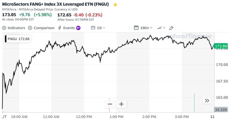 金利が下がり株価も終始上がり続けた相場、FNGU173.05+9.76 (+5.98%)、FNGUの中のSNOWが10.66%の爆上げで引っ張られた感じ、TQQQ39.08+1.07 (+2.82%)と比較するとよく分かるが、ナスは全体的に上げてるがFNGUはビックテックに特化してるので上りが大きい。但し、下落相場は逆で下がりは大きくなる。SOXL18.60+0.35 (+1.92%)はイマイチで一目(一目均衡表)ではようやく雲に入った感じ、一方ナスは既に雲を突破している。因みにS&Pもダウもまだ雲の中。
