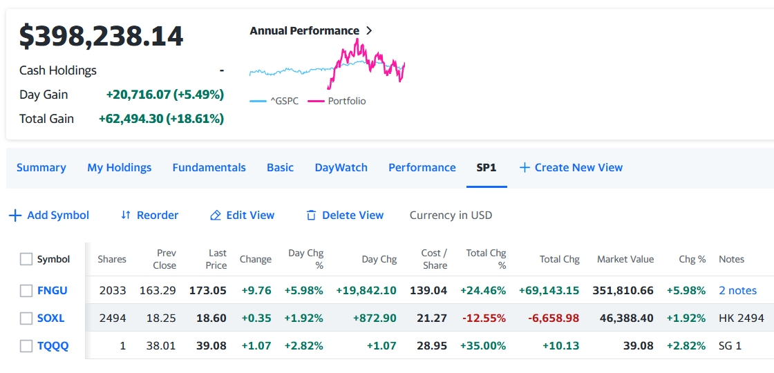 本日はトータルで+20,716.07 (+4.00%)の大幅プラス、半導体がイマイチだけど年末に掛けて様子見。ザラ場中に一時期40万ドル突破したが終値まで持たなかった、40万ドル奪還は目と鼻の先だ。