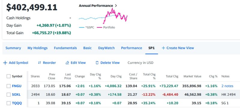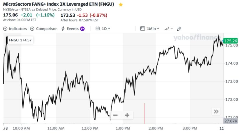 FNGUとSOXLもプラス引け、本日は午前中は下落してスタート、お昼頃から切り返して3時くらいからまた下落しだしたので本日はマイナス引けと思われたがプラス引けで終了。ナスダックは9連騰。