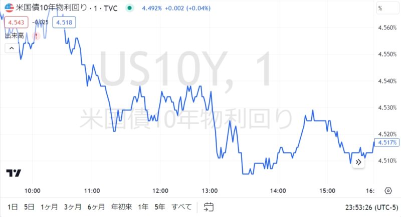 金利はザラ場開始からずっと下落だったが、株価はお昼から折り返したが、午前中は下落。4.5%切ればさらに株価は上昇しそうな感じ。
