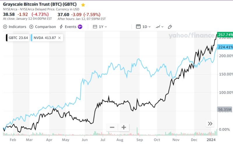 上のチャートはグレースケールの現物ビットコインETFの1年のチャートである。昨年AIで盛り上がったGPUを生産しているエヌビディアとビットコインEEFの比較チャートである。なんと年間でエヌビディアよりもビットコインETFの方がパフォーマンスが良い結果になっている。ビットコインETFはSECの承認が材料になっていたので後半にグイッと上昇したせいもあるが上々の成績である。更に今年はビットコインの半減期を控えているので今年は更にビットコインETFが上昇しやすい環境が整っているのである。