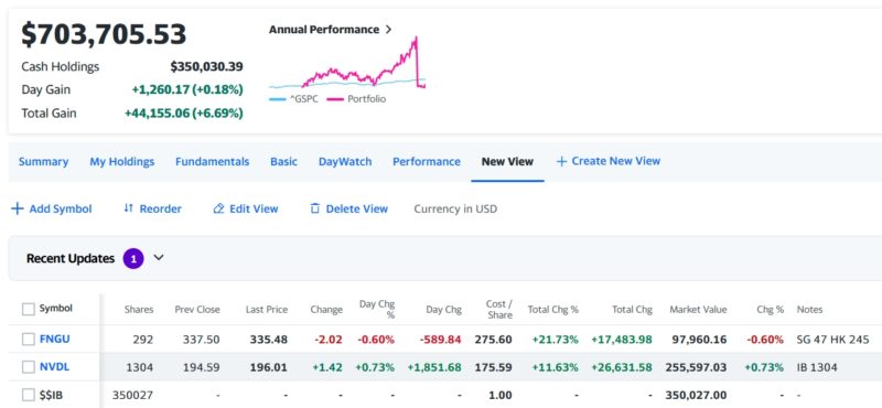 トータルで-1477.66(-0.20%)のマイナスで引けた。今日はNVDLを半分売ったので、上のポートフォリオのDay Gainの数値が正確では無いので昨日の終値と本日の終値から正確な増減を計算した。現金は35万ドルあるので下がったら買い進めるし、さらに上げてもNVDLを半分持っているので、ゆっくりやろうと思う。いつもは欲をかいて焦って全力して自滅するので、今回は上手くやろうと思う。