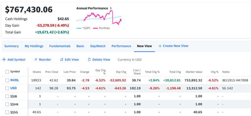 トータルで-53,270.59 (-6.49%)のマイナスで引けた。半導体株がエヌビディアを始め全体的に売られた1日だった。2倍のスピードで下落するので、いつ調整が終わるかの忍耐の相場になってきました。