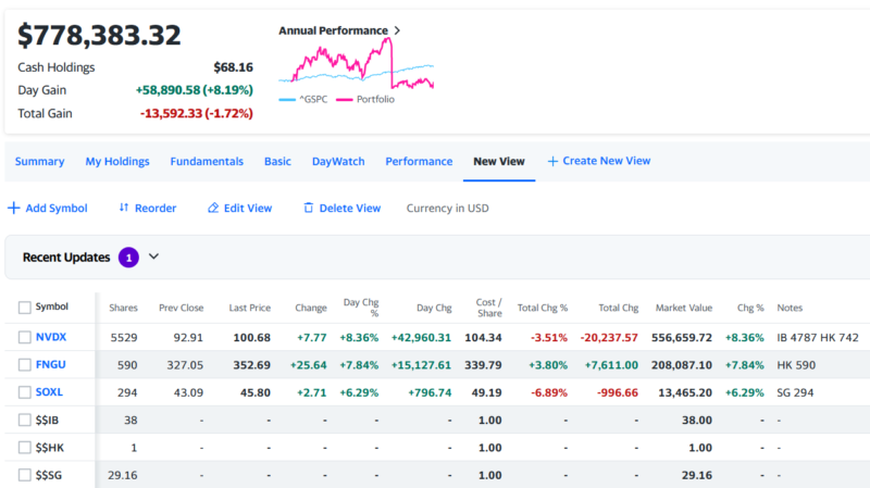 トータルで+$58,890.58 (+8.19%)の爆上げでザラ場は終了。CPIとPPIを通過したので一旦大きく戻し買いが入ったが、今後も引き続き買いが入るのか、今日だけの戻り上げなのか不明。