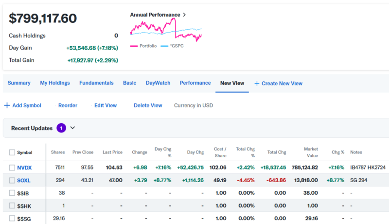 トータルで+$53,546.68 (+7.18%)の爆上げでザラ場は引けた。80万ドルに迫る勢いで含み益が回復中である。含み益の今年の最高値は約88万ドルなので、取りあえずは88万ドルが目標で株価見てます。
