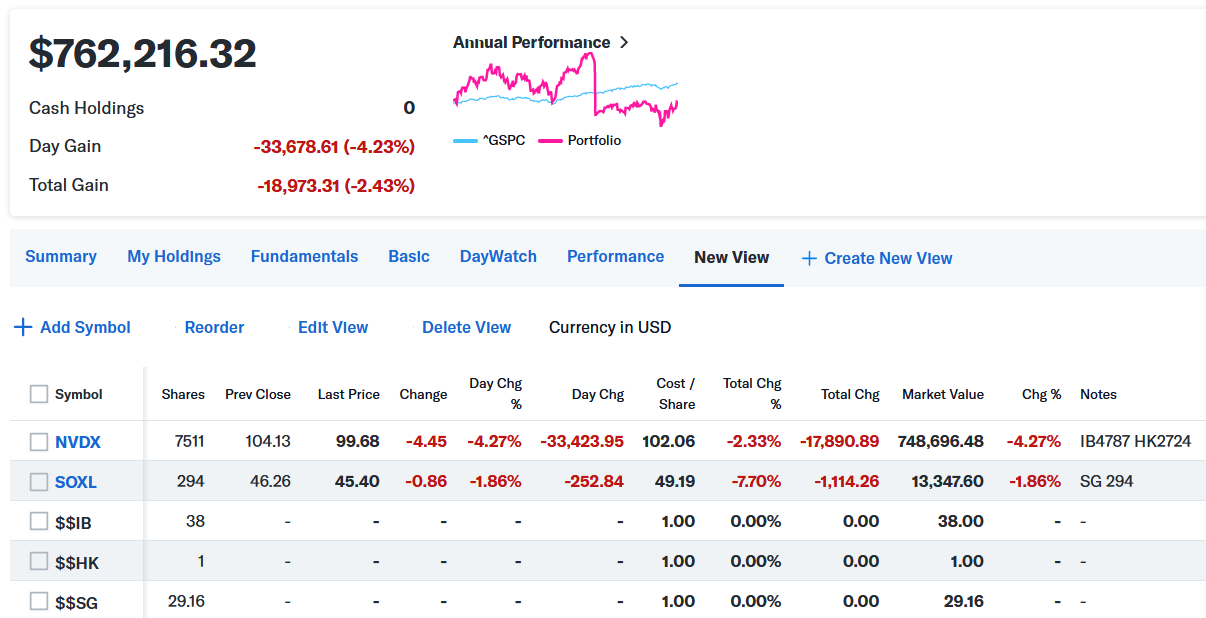 トータルで-$33,678.59 (-4.23%)のマイナスでザラ場は引けた。エヌビディアは来週水曜日のザラ場引け後に決算発表なので来週も月曜から水曜迄、決算をまたぎたくないホルダーが売って来ると思われる。