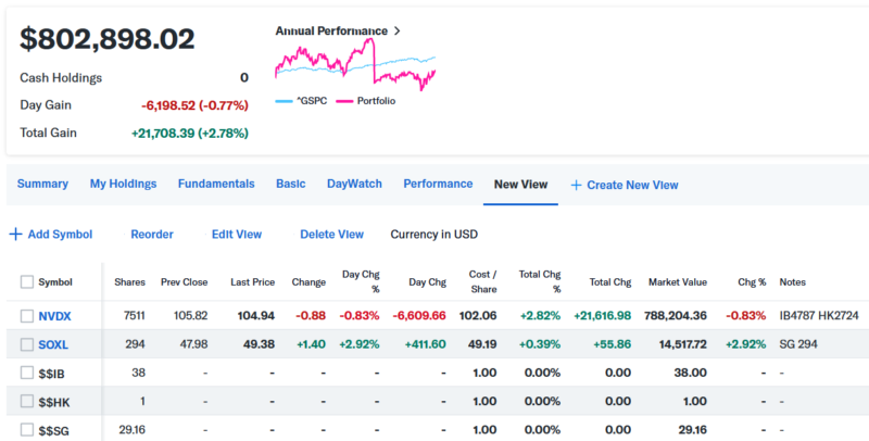 トータルで-$6,198.52 (-0.77%)のマイナスでザラ場は引けた。しかしNVDAの決算発表後のアフターマーケットで爆上げで終了した。いくらまで上昇するか、明日のマーケットが楽しみである。