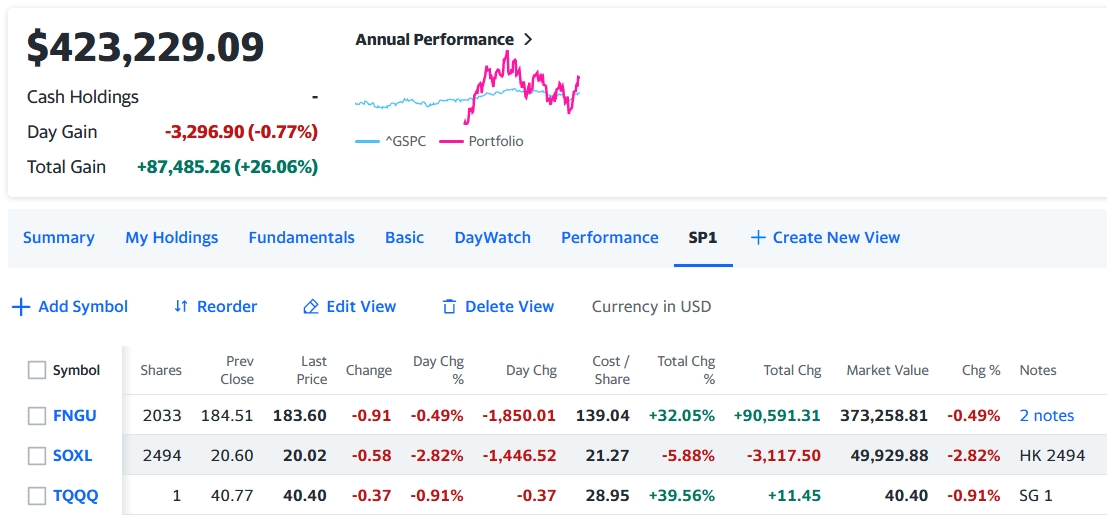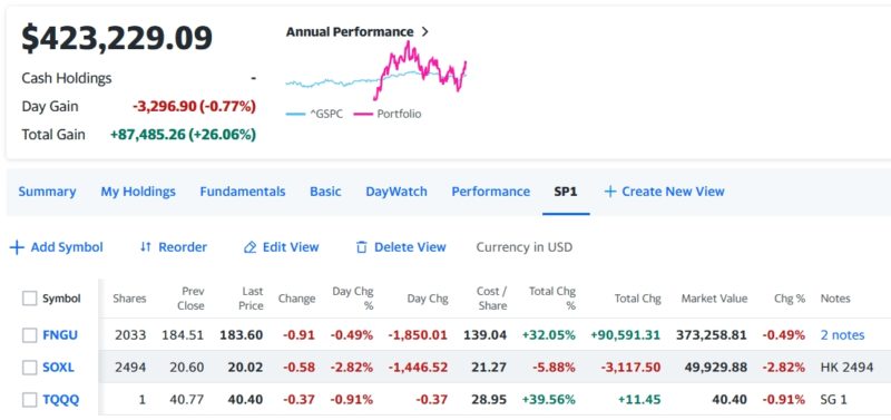 トータルで-3,296.90 (-0.77%)のマイナスではあったが、本日はムーディーズが米国債の格付け格下げで暴落と予想していたので、思ったよりも下がらないで終了の印象だった。SOXLは1,446.52(-2.82%)のマイナスだったが先月からポジションを低くしてるのでさほど影響はなかった。