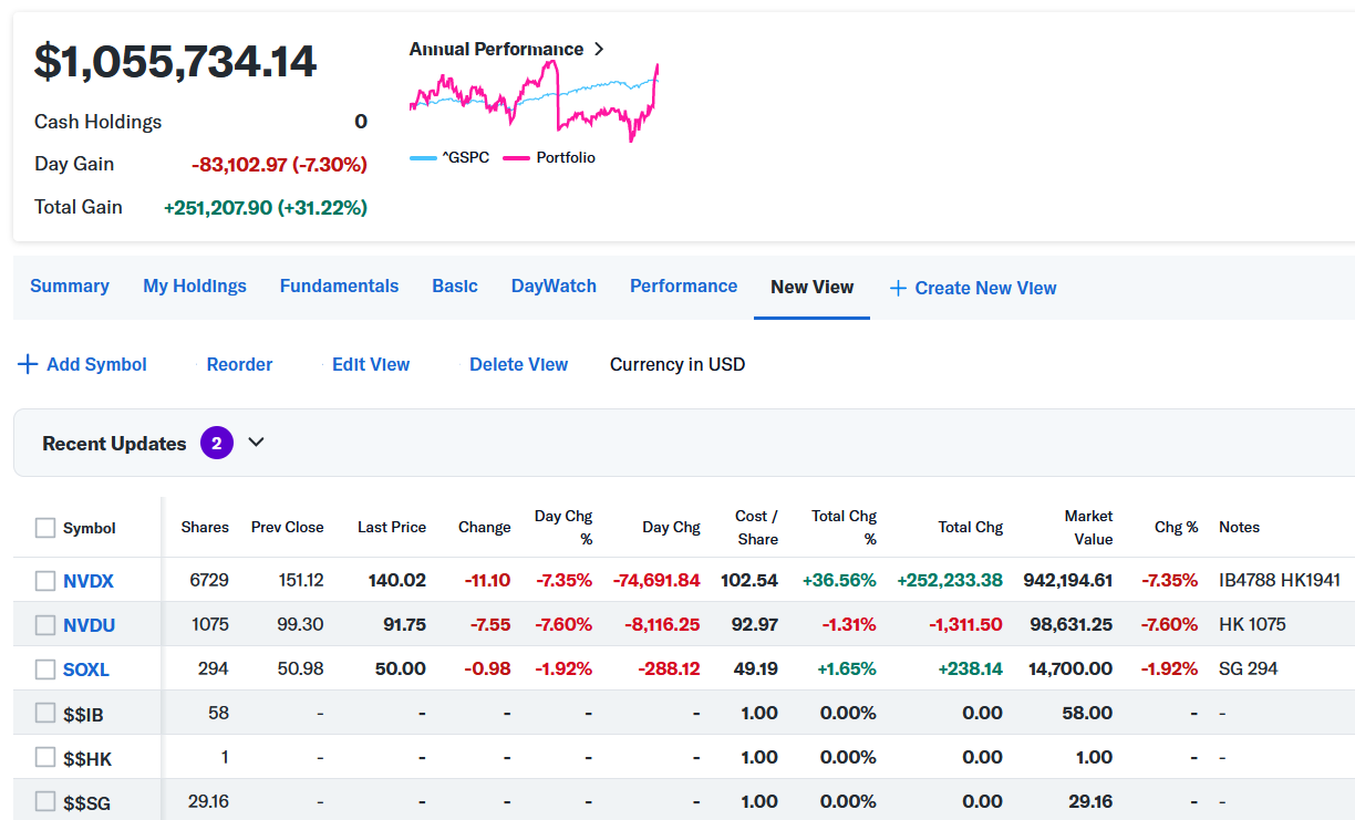 トータルで-$83,102.97 (-7.30%)のマイナスでザラ場は引けた。本日は指数の地合いの悪い中で、エヌビディアのレバ2倍のNVDXとNVDUはザラ場後半で大きく下げた。