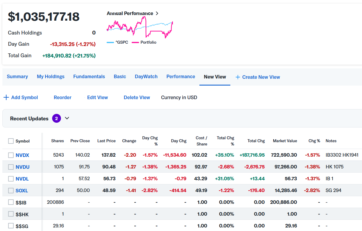 トータルで-$13,315.25 (-1.27%)のマイナスでザラ場は引けた。上でも書いたが20万ドルはキャッシュポジで$$IB(IB証券)に保有中。現在3つの証券会社で株取引してるけど、今年の初めまでは、IB証券に資金を集中させて取引を行ってたが、IBでメインの一部の銘柄が取引できなくなり、仕方なく他の証券会社に分散して取引しているが非常に効率悪いので、何とかしたいがどうにもならない状態。例えばIBで買えない銘柄を他で買えても、プレマーケットに参加できなかったり、色々不便なのだ。