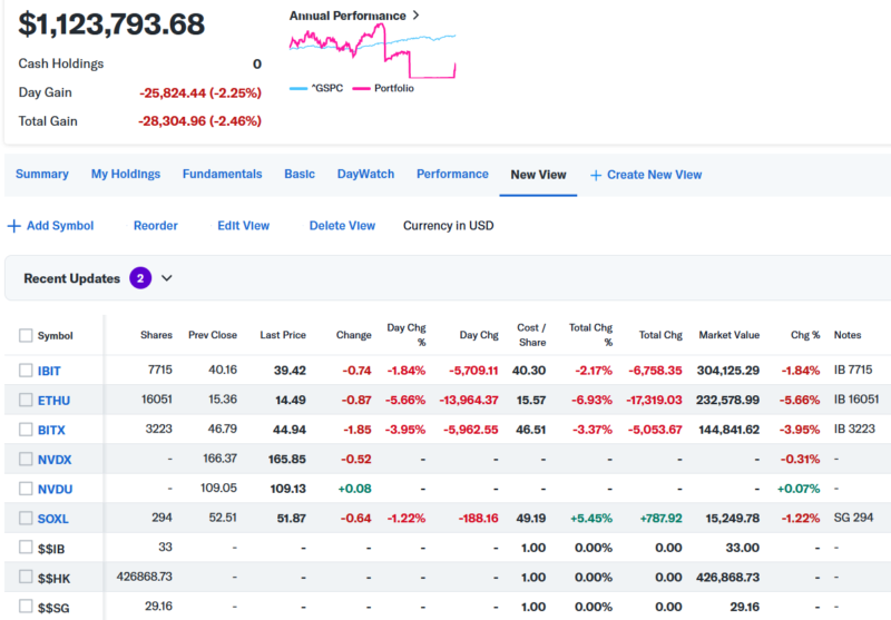 現在、エヌビディアを買い戻すまでは仮想通貨ETFがメインになっているので、ダメージはそれなりにあったが、この暴落で難平しようと思い、ビットコインETFのIBITを10万ドル売却して、先物イーサリアムETFのレバ2倍のETHUを5万ドル購入、そして先物ビットコインETFのレバ2倍のBITXを5万ドル購入した。