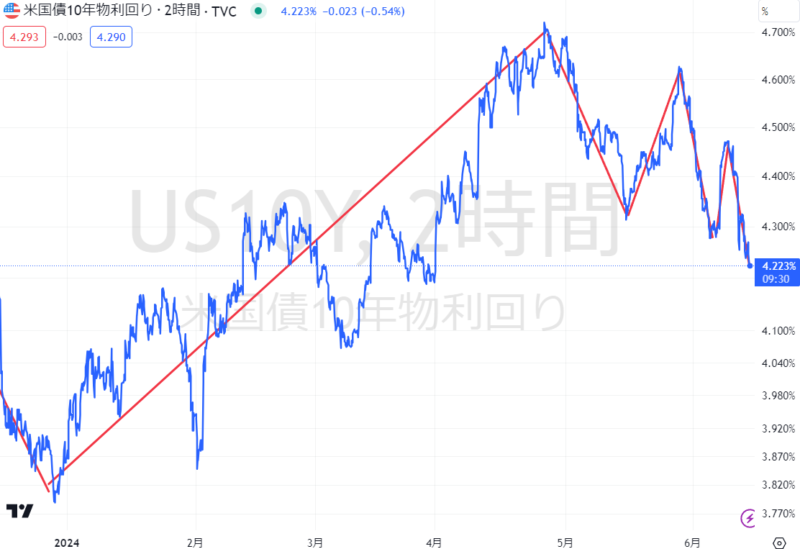 上記のチャートは金利の6ケ月チャート、こうやってみると金利は下に行くのがほぼ確定なのが分かる。最近の経済指標は軒並み米国の不景気を表しているし、FOMCのドットプロットの中央値でも利下げ1回はほぼ確定のようなので、金利が上がる理由が無い。