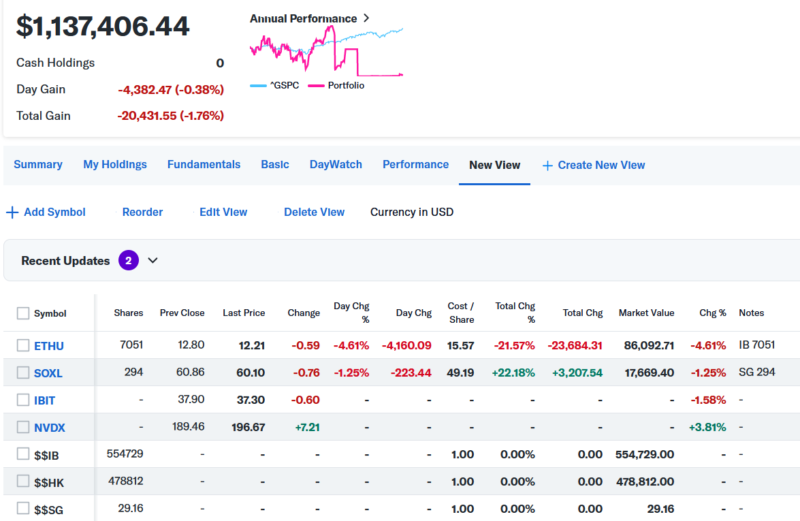 その他は、現物ビットコインETFのIBITも全数売却した。これは持っていても上がる物なので、持っていてもいいのだけど、マイナス垂れ流していると機会ロスが発生するのでスッパと切った。その他の先物イーサリアムETFのETHUも売却しようとしたが売買ボリュームが少ないようで売却出来なかった。これは現物イーサリアムが近くローンチされるので、これもマイナス垂れ流してるけど保有する事にした。
