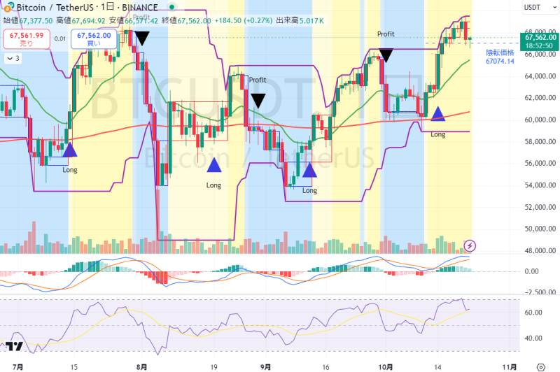 OKLOは本日も20%を超える大きな上昇でだった。先週に一旦入ったがすぐに売却したが、今後も小型原子炉とウラン相場は観察して行きたい。下のチャートはビットコイン/USDTのチャートだが、本日一旦下がったが、まだまだ20日線の上であり上昇は終わって無いように見える。ビットコインも一旦売ってしまったが、大統領選挙後に上げそうなので、ビットコインも今後も動向を観察して行きたい。