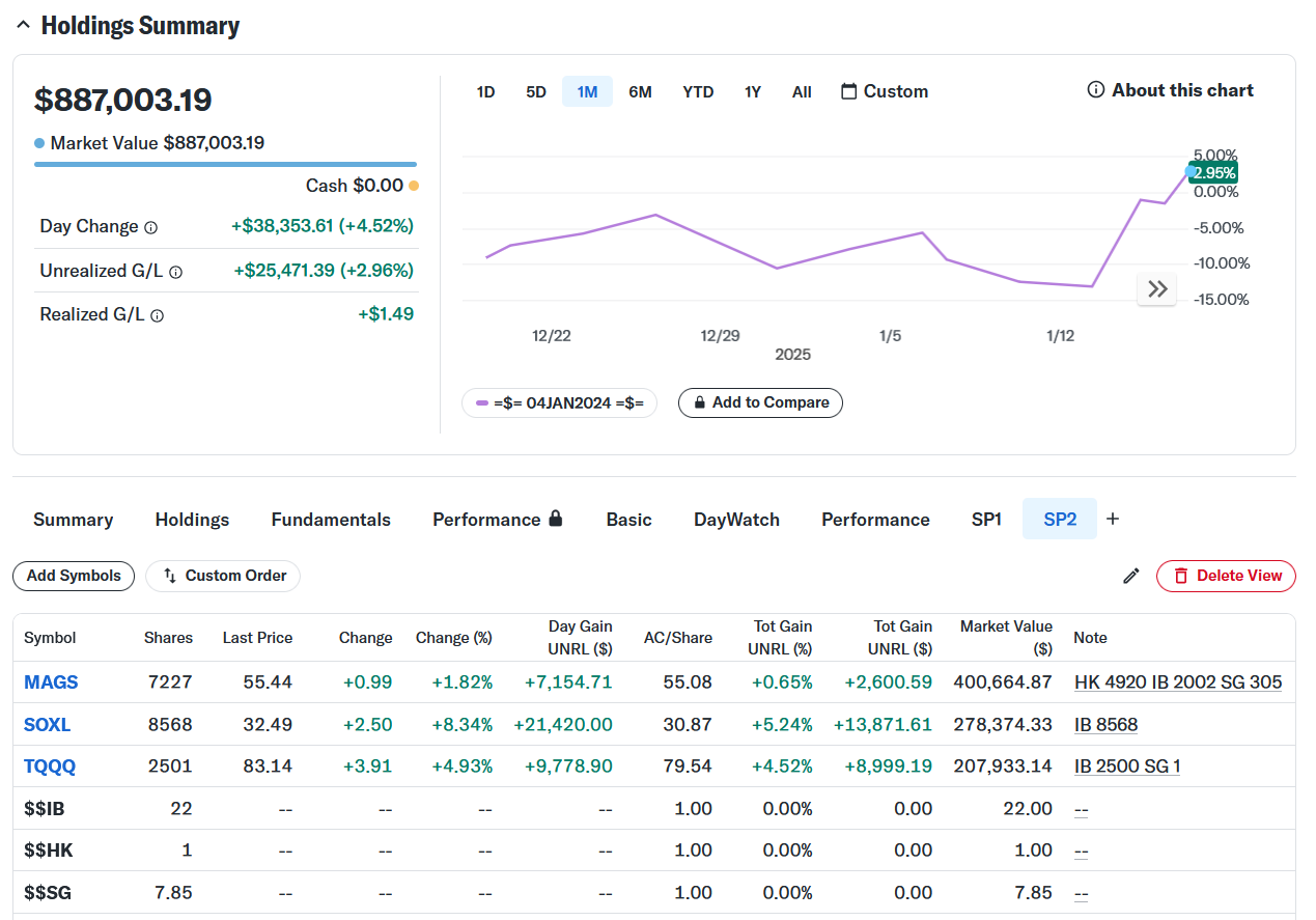 ノンレバ(レバ無し)は約40万ドル、レバ3倍が約48万ドルの合計約88万ドルのポートフォリオ。