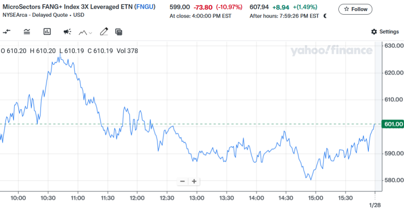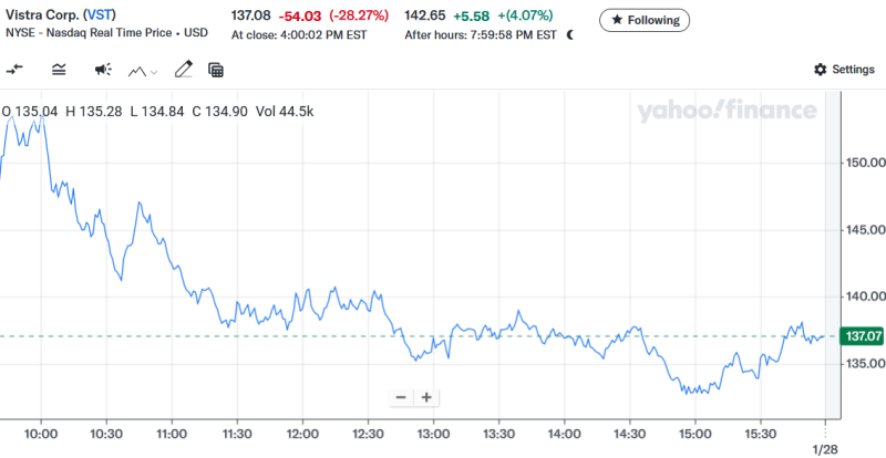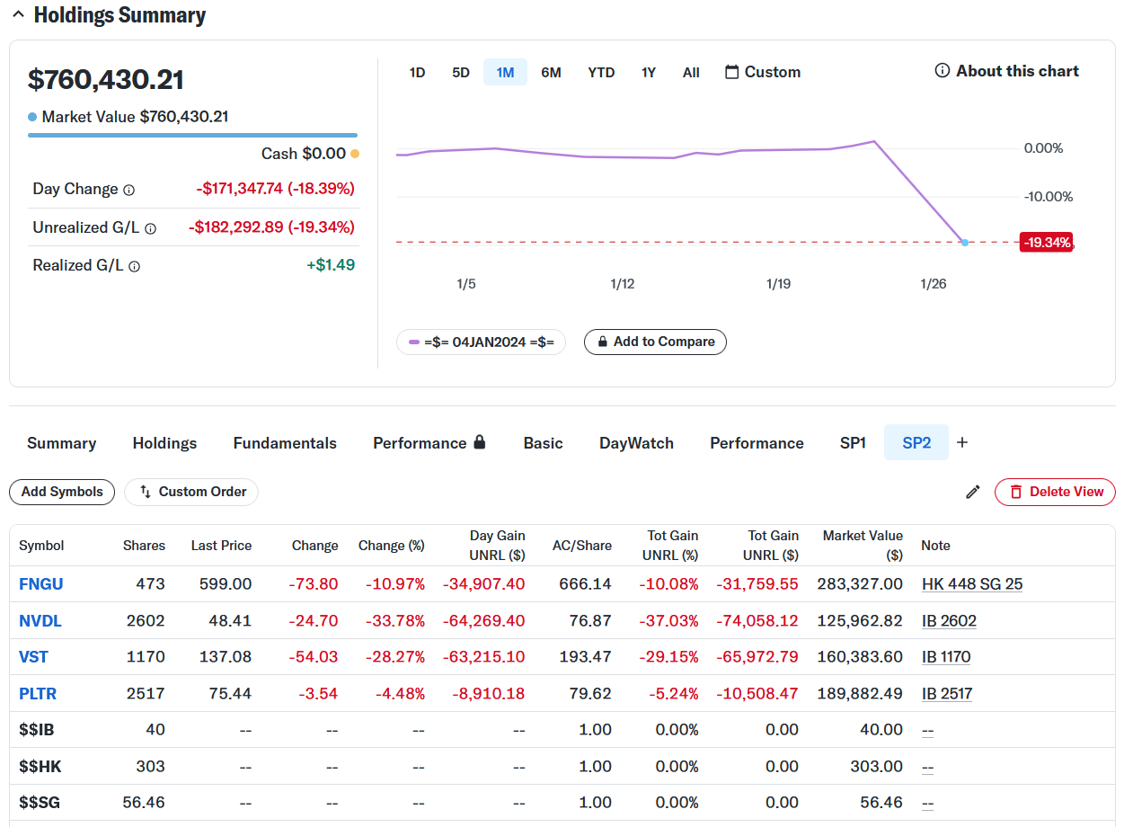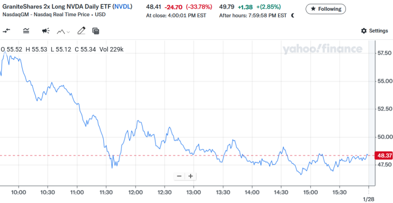 結果、プレマーケットからすでにAI周りの銘柄は大暴落、ザラ場はNVDLが-33.78%の大暴落で終了。AIデータセンターの電力需要で上げていた電力株も軒並み大暴落、私所有の電力大手のVSTも-28.27%の大暴落で大きな損失を被った。半導体やAI系以外のダウ銘柄などはあまり影響が無かったようだ。
