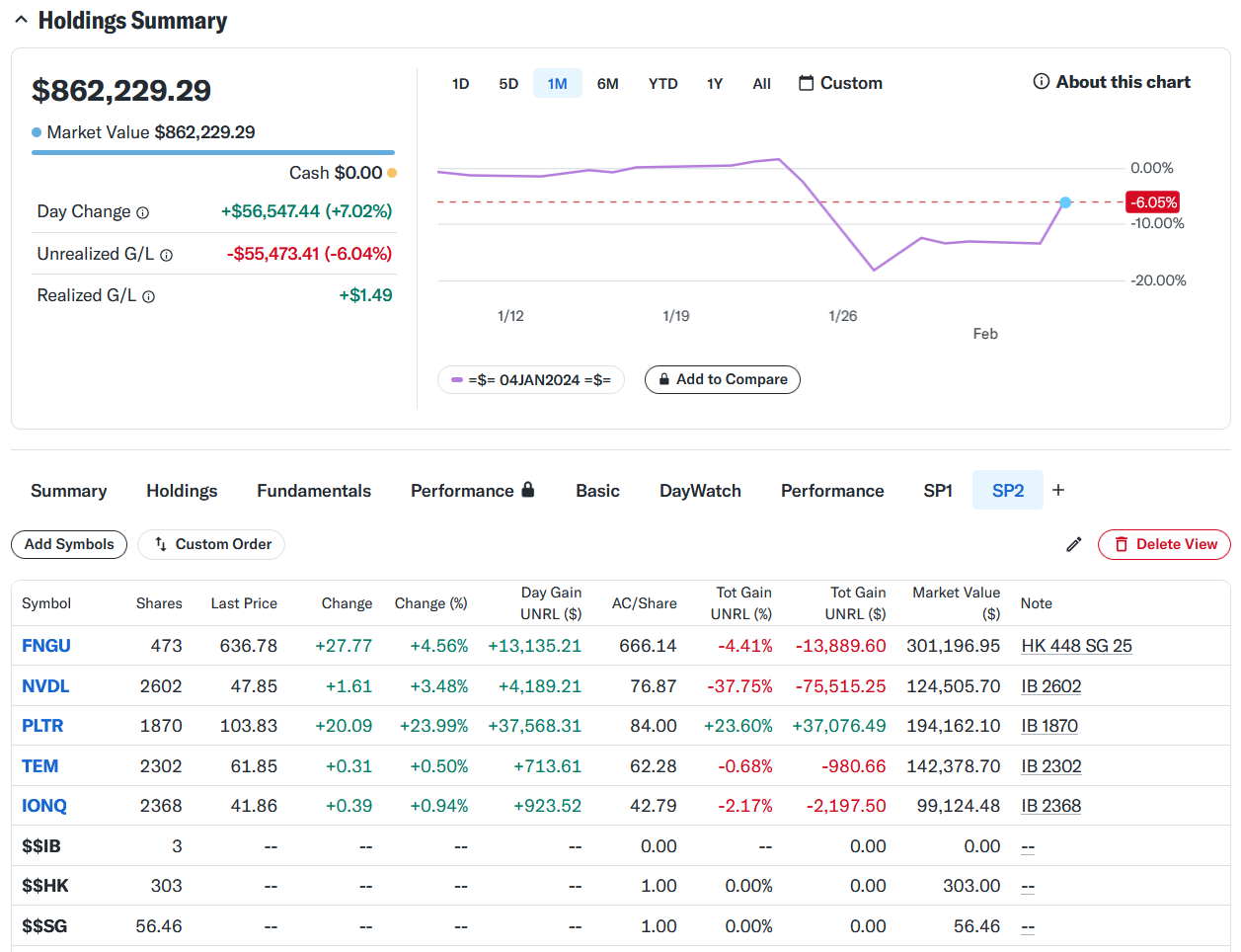 本日は、まず動きの良くない電力会社のVSTを全部売却、売却代金約15万ドルの内、5万ドルでAIヘルスケアのTEMを買い増し、そして新規で量子コンピューターのIONQを約10万ドル購入した。持ち株では昨日の引け後の決算でパランティアが暴騰して今日は大きな利益を出した。