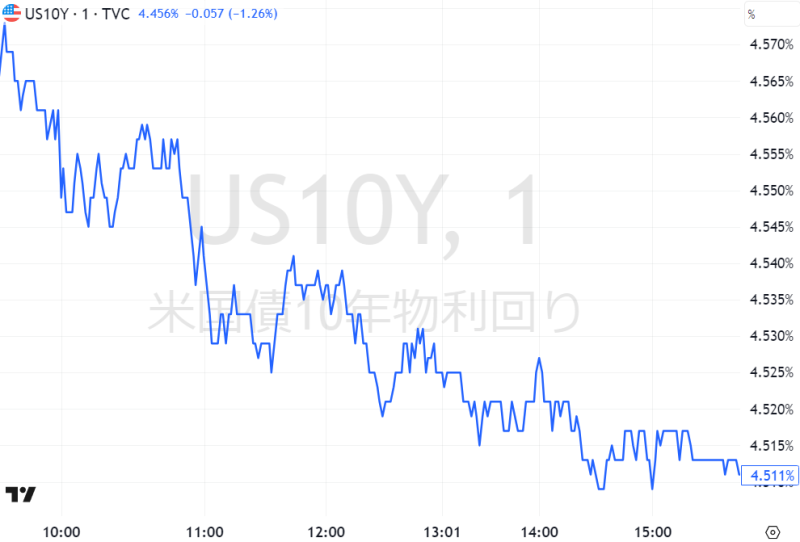米国債10年金利は、本日終日下げ続けた。ハイテク大型株は金利の低下で終盤に上昇したが、相場全体では余り金利の低下で株価の上昇は見られなかった。
