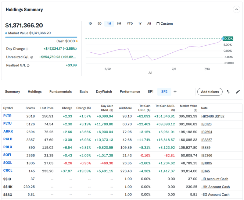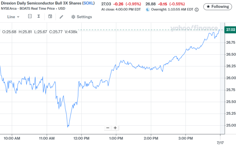 Day Changeは+$40,187.01(+3.02%)のプラスでザラ場は引けた。持ち株はSOXL以外はプラス引けした。上の画像のDay Changeの表示は本日複数の売買を行ったので正しく表示されていない。その為、前日の終値のマーケットバリューと本日の終値のマーケットバリューから正確なDay Changeを計算した。