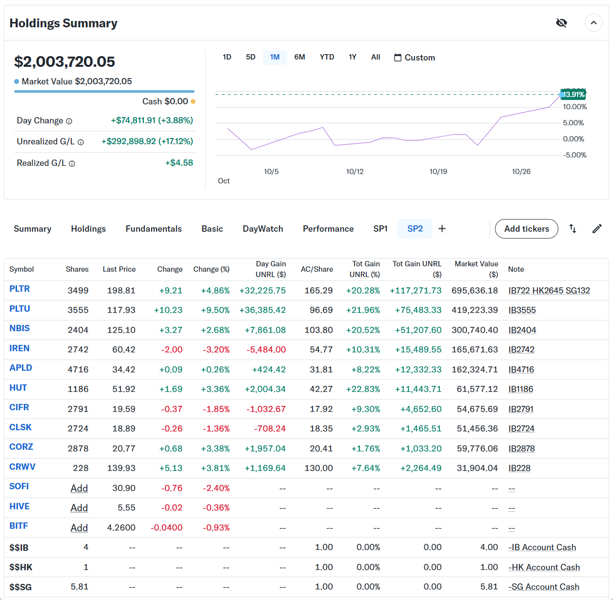 Day Changeは+$73,410.74(+3.80%)のプラスでザラ場は引けた。200万ドルまで戻ってきたが、節目の今月のFOMCが今日終わったのと、パウエル議長の発言で一旦調整が来そうな雰囲気である。上の画像のDay Changeの表示は本日売買を行ったので正しく表示されていない。その為、前日の終値のマーケットバリューと本日の終値のマーケットバリューから正確なDay Changeを計算した。