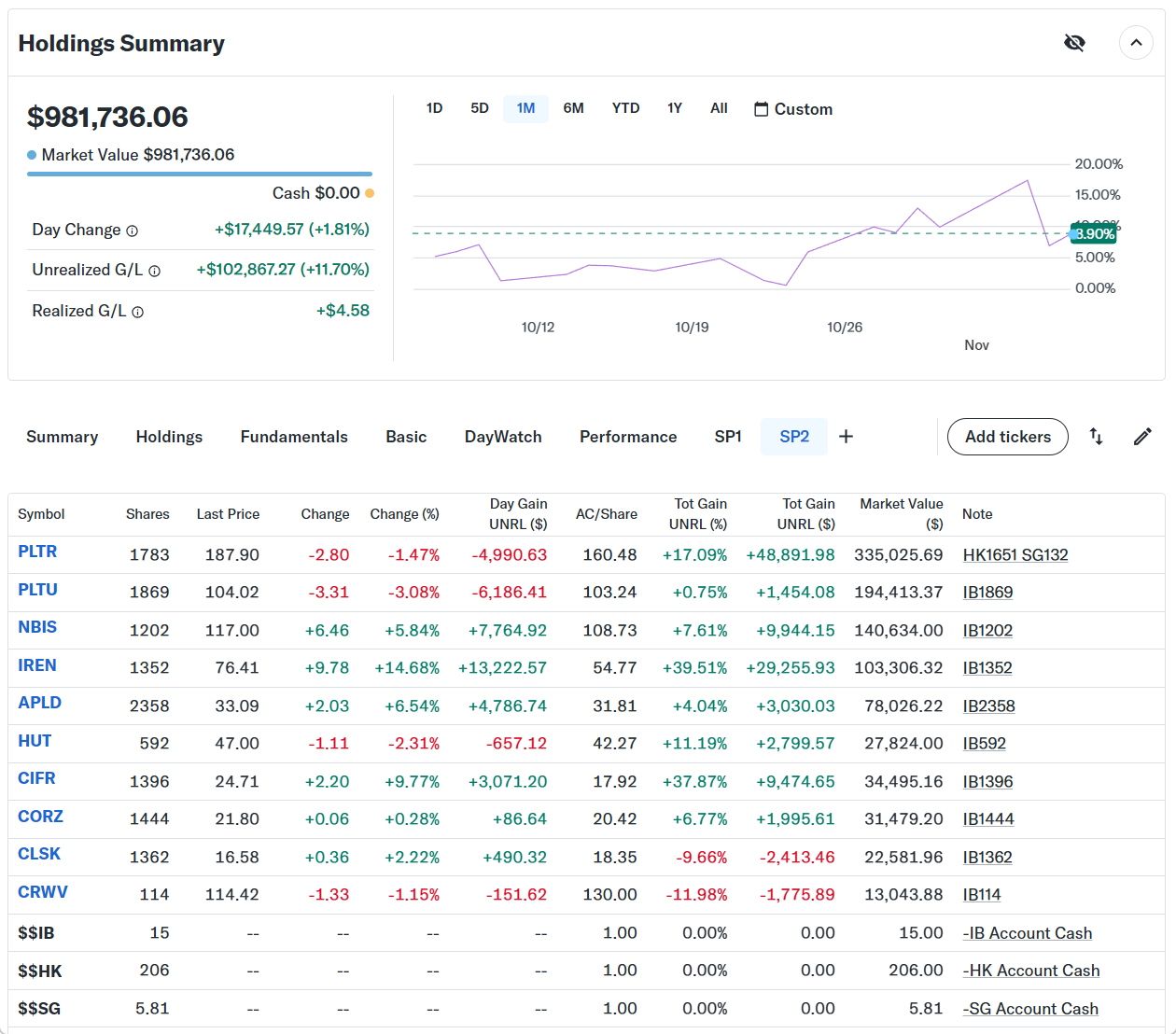 持ち株の方は、序盤に昨日に来引き続きメインのパランティアの売り圧が強くて、一旦パランティアのレバ2倍PLTUはすべて売却した。中盤から買いが入ってきたので全て買い戻した。その他は変更なし。