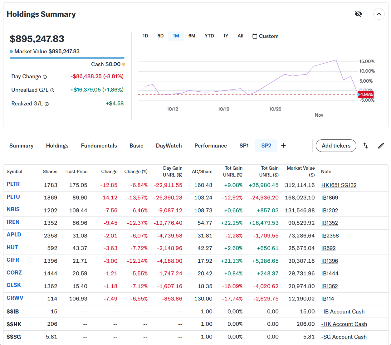 Day Changeは-$86,488.25(-8.81%)のマイナスでザラ場は引けた。