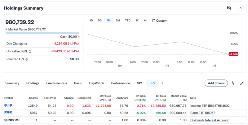 Day Changeは-$11,294.08(-1.14%)のマイナスでザラ場は引けた。