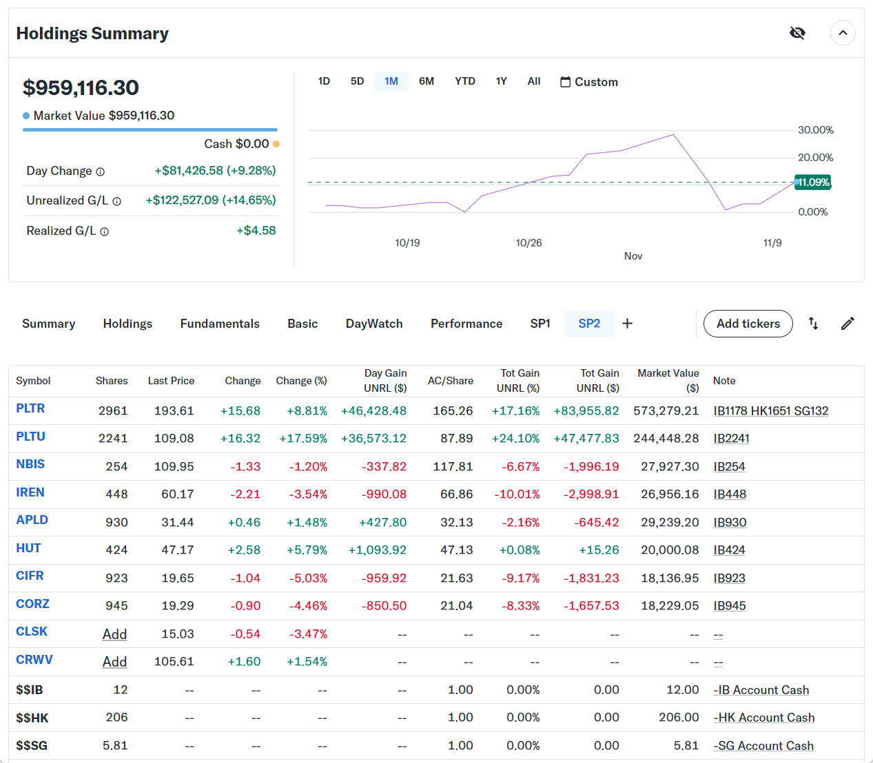 持ち株の方は、金曜日にパランティアに資金を集中させていたので、プレマーケットの段階で15万ドルほど売却してデータセンター株のNBIS、IREN、APLD、HUT、CIFR、CORZを少額で買い直した。パランティアが大きく上げたので大きなプラスで終わった。