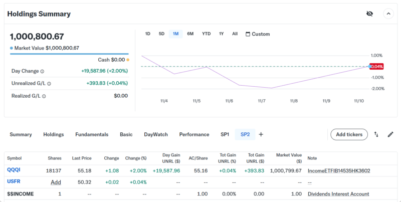 Day Changeは+$79,208.71(+9.00%)の大きなプラスでザラ場は引けた。上の画像のDay Changeの表示は本日複数の売買を行ったので正しく表示されていない。その為、前日の終値のマーケットバリューと本日の終値のマーケットバリューから正確なDay Changeを計算した。