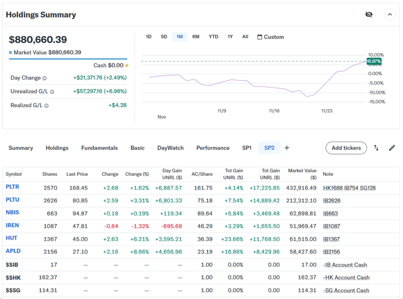 持ち株の方は変更なし。データセンター株のIRENだけがマイナスに終わったが、戻り相場に乗って資産が回復している。