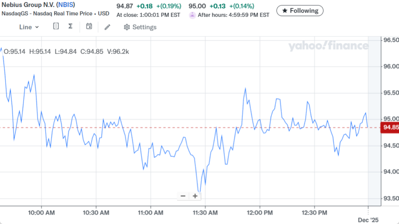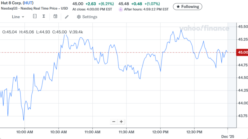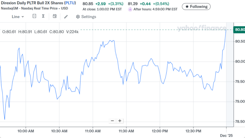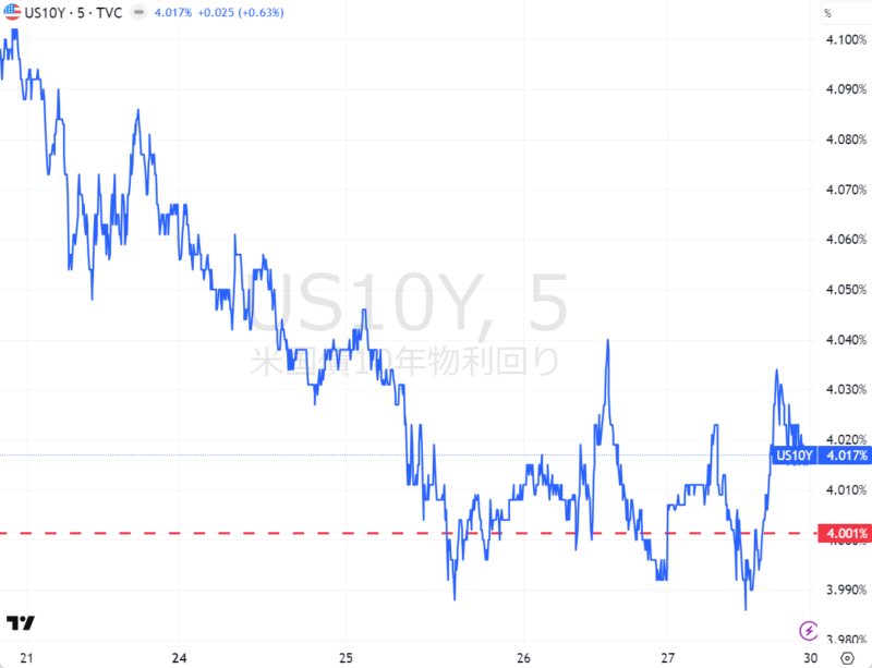 米国債10年金利の5日間チャート。12月の利下げを織り込んで、ここ1週間近く下げていた金利が意識される4.0%のラインまで下がってきて、4.0%を上下しながらヨコヨコしている。