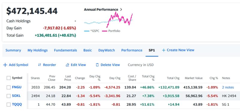 本日の私のポートフォリオはトータルで-7,917.02 (-1.65%)のマイナスで引けた。半導体レバレッジ3倍のSOXLは引け後のエヌビディアの決算を警戒して暴落、FNGUもエヌビディアが構成比で10%で更に3倍のレバレッジ掛かってるので同じく軟調な動くで終了。