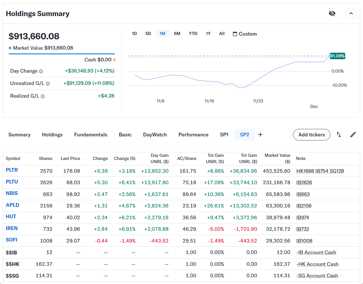 持ち株の方は変更なし。メインのパランティアが連日の戻り相場で上げている。不安定なデータセンター株も今日は上げてきた。