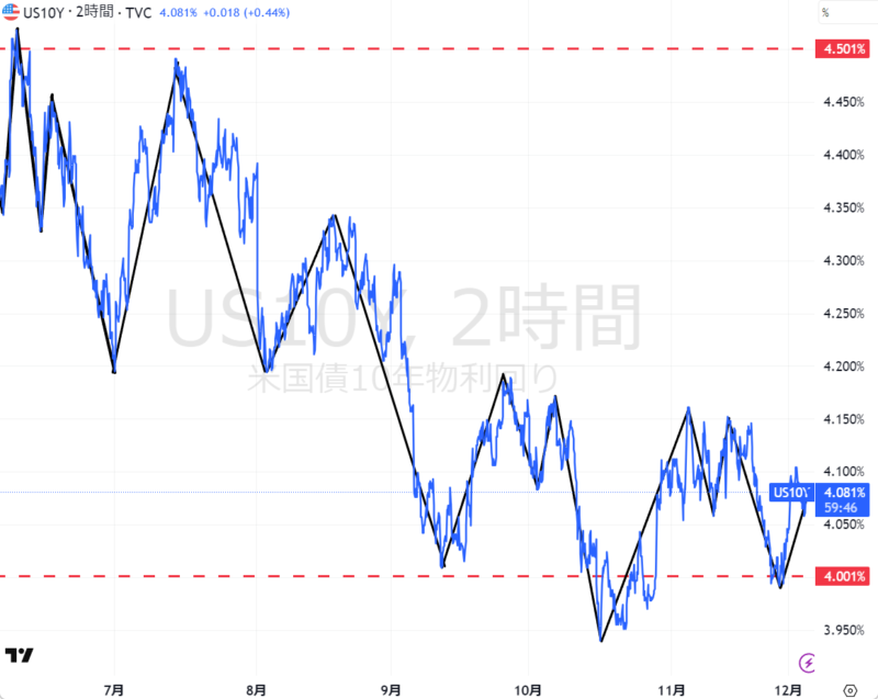 米国債10年金利の6か月チャート。6か月間上下しながら下げてきて4%のラインで下げ止まった感じ。