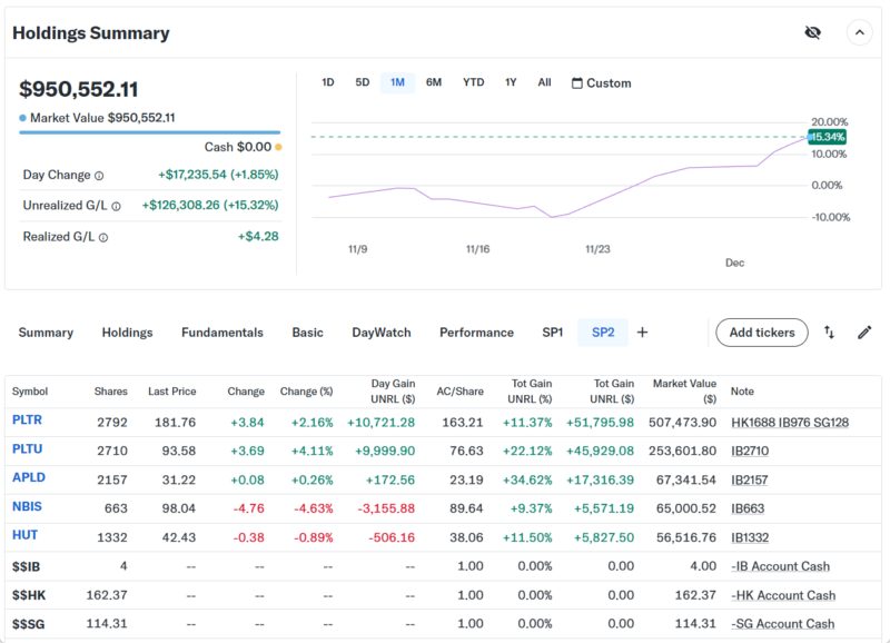 持ち株の方は、保有してるデータセンター株の中でIRENだけ20日線の下で戻りが遅いので、売却して、毎日大きくは無いが上昇してるパランティアを買い増した。因みにデータセンター株の保有株の中で暴落以降の上昇で一番稼いでいるのがAPLDでチャートも良い感じ。