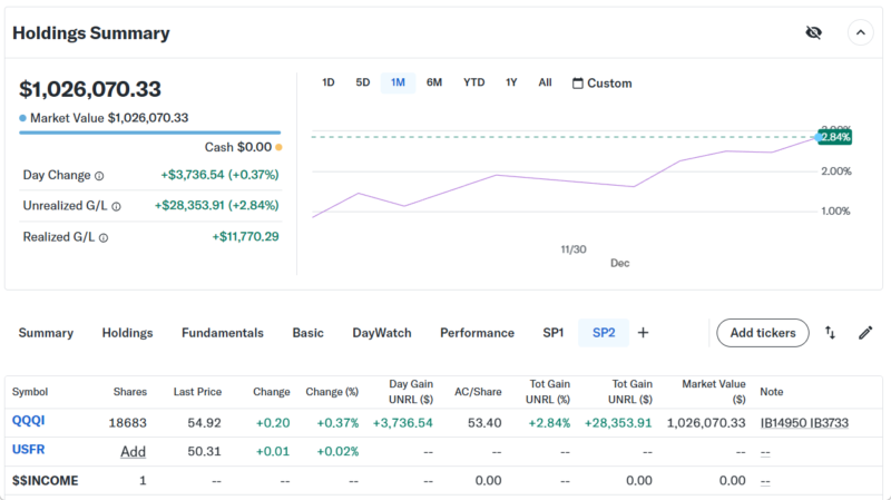 Day Changeは+$15,086.70(+1.61%)のプラスでザラ場は引けた。上の画像のDay Changeは本日、売買をしたので正しく表示されていない。その為、前日の終値のマーケットバリューと本日の終値のマーケットバリューから正確なDay Changeを計算した。