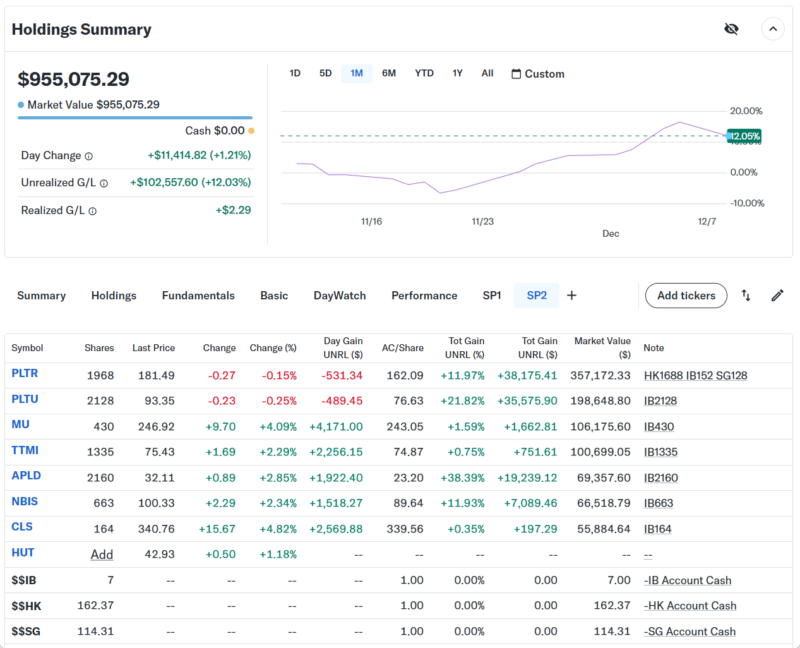 持ち株の方は、AI軍事産業のパランティア(PLTR、PLTU)を一部売却、更にデータセンター株のHUTを全部売却して、その資金で半導体メモリ大手のMUとプリント基板大手のTTMIとデータセンター設置業のCLSを購入した。データセンター株は余り動きが良くないので一旦減らした。 マイクロン(MU)は40年続けたコンシュマー向けのメモリとSSDの販売を終了してAI需要に対応する発表があった。PC自作もする私としては高品質なマイクロンのメモリやSSDがもう手に入らないのは寂しい限りだが、それだけAI需要がある証拠で、業績も上がりそうなのでMUを買った。