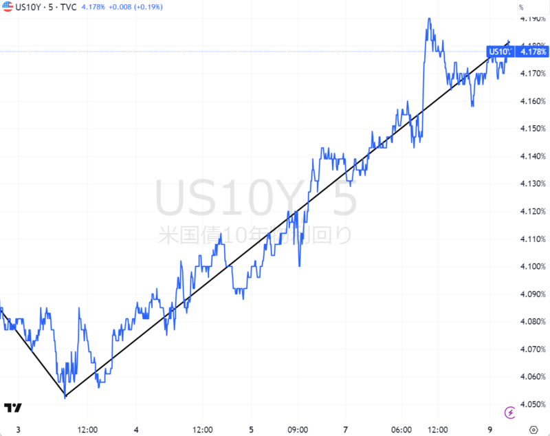 米国債10年金利の5日間チャート。ほぼ一直線で上昇しているのが分かる。