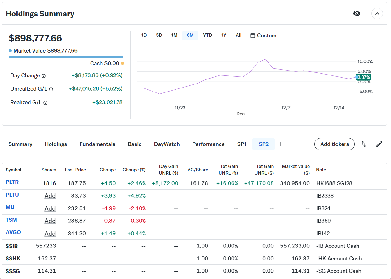 本日は、明日の早朝から年に1度の健康診断なので、いつものように朝まで相場に張り付いて寝ないで病院に行くわけにもいかないので、相場は1時間程見て今日はすぐ寝ました。よって今日の相場はよく分かりません。因みにサブ証券で保有のPLTRと高配当銘柄のQQQI以外のIB証券の保有銘柄は一旦全て売ってから寝ました。