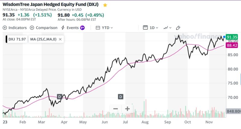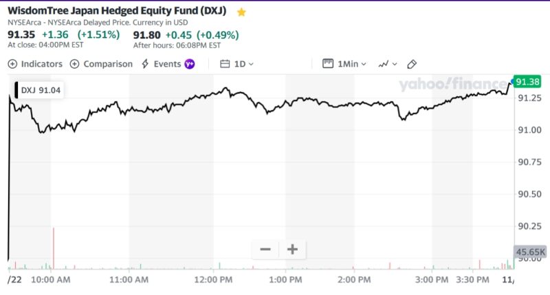 ドル建てヘッジ有り日本株ETFのDXJは91.35+1.36 (+1.51%)のプラス引け。年初来(YTD)のチャート見ると順調に上げているのが分かる。今後も日本株上がるならドル建てヘッジ有りDXJは魅力的なETFです。ただこれから米国長期債の金利は低下して行くので、それに伴い円高が進むと日本株の原動力の円安が無くなっていくので順調に日本株が上がっていくのか疑問もある。