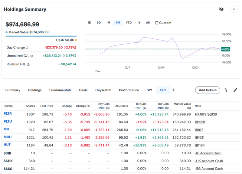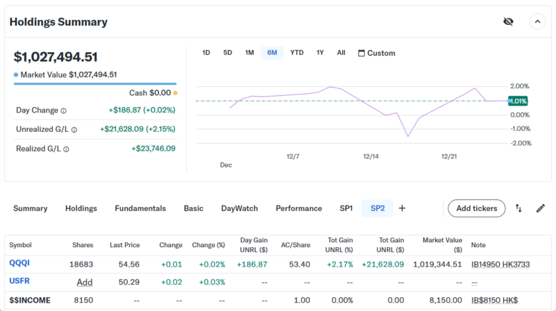 Day changeは+$186.87(+0.02%)のプラスでザラ場は引けた。本日はQQQIの12月の配当が一部振り込まれた。QQQIは全部で18,683株保有してるが、2つの証券会社に分散して持っている。本日入金されたのはIB証券の14,950株分で$8,150(米国税抜き、約127万円)。サブの証券会社の残り3,733株の方はまだ振り込まれていない。配当は生活費に充てるので出金予定で再投資はしない。