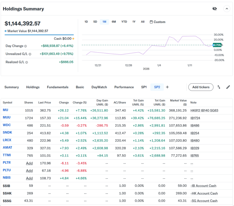 持ち株の方は大きくポートフォリオを変更した。昨年を通して主軸で保有していたパランティア(PLTR)とパランティアのレバ2倍PLTUを売却した。更にデータセンターのNBISも売却した。IB証券で保有していたマイクロン株を一旦売却して、別の証券会社で同じ数量を買い直して株式を手作業で移管した。現在3つの証券会社を使ってるがIB証券以外は使い勝手が悪いのであまり動かさない株はIB証券以外で保有している。売却した資金で、WDC、SNDK、LRCX、AMAT、TTMIを買い増した。マイクロンの役員のマイクロン株大量保有状況が公開されて、それを理由に今日はマイクロン株が上昇した。
