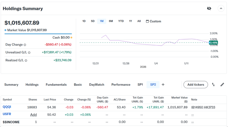 Day Changeは-$560.47(-0.06%)のマイナスでザラ場は引けた。個別株のポートフォリオは大きく上昇したが、ナスダック連動のQQQIはマイナスで終わった。アップルなどの指数をけん引して来た大型のビックテック株が昨年末から売られているので指数は全体的に伸びない。