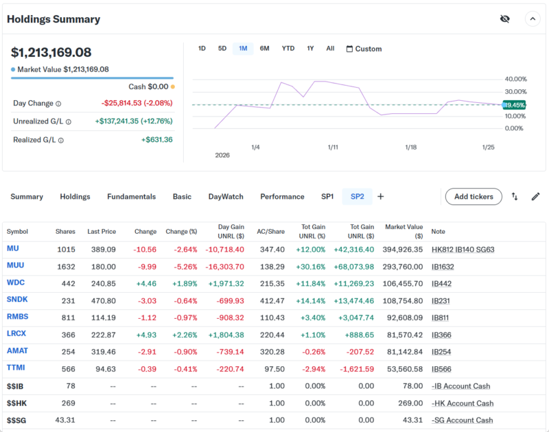 持ち株の方は変更なし。持ち株では半導体ストレージのWDCと半導体装置のLRCX以外はマイナスだった。