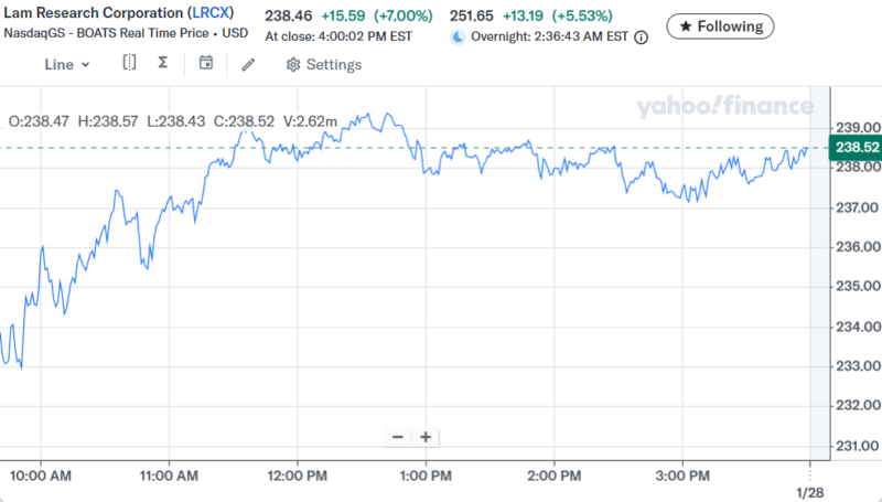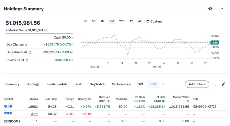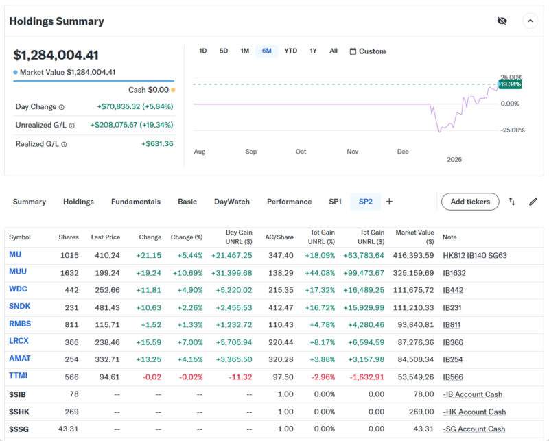 Day Changeは+$70,835.32(+5.84%)の大きなプラスでザラ場は引けた。今年のAI相場の本命と思われる半導体セクターに資金が流れ込んでるように見える。