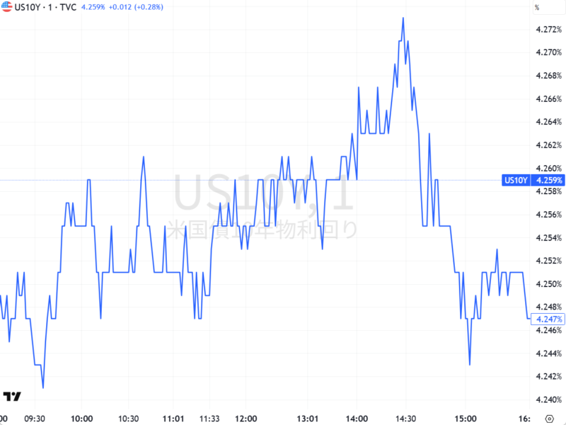 今日の米国債10年金利のチャート。FOMCが始まって金利が据え置きとわかり、金利は一旦上昇したが、すぐに反転して下げだし金利は戻して終わった。